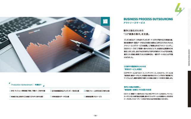 CAD技術を基幹サービスとして、建築業界の様々なサービスを展開する株式会社CADネットワークサービス様の会社案内を制作させていただきました。事務所移転を機に、ブランディング及びサービス内容の再構築を行う事を目的にデザイン作成を行いました。ブランドカラーを効果的に使用する事で各コンテンツがブランドイメージを踏襲し、それぞれのサービスの先進的なイメージ写真は企業の成長を表現しています。表紙と導入部のビジュアルにしかけを作ることでユーザーの興味を引きつける会社案内に仕上げました。各コンテンツページはビジュアルスペースを大きく使いながら余白を充分にとってデザインされているのでスマートで高級感を感じるパンフレットとなりました。